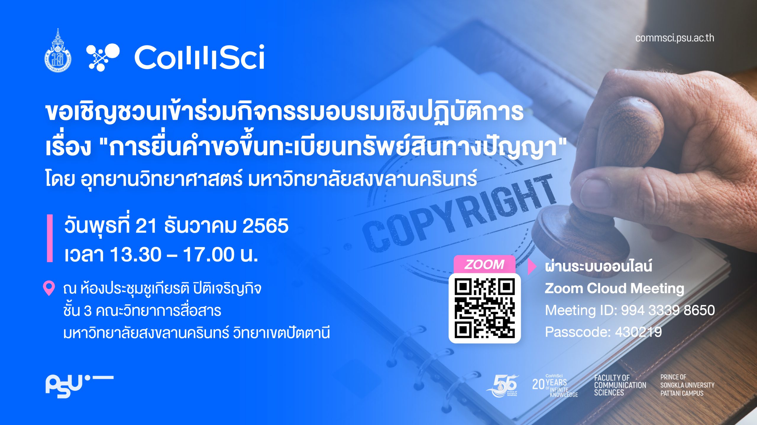 งานวิจัย คณะวิทยาการสื่อสาร ขอเชิญเข้าร่วมกิจกรรมอบรมเชิงปฏิบัติการ เรื่อง “การยื่นคำขอขึ้นทะเบียนทรัพย์สินทางปัญญา” โดย อุทยานวิทยาศาสตร์ มหาวิทยาลัยสงขลานครินทร์ เพื่อส่งเสริมแลกเปลี่ยนเรียนรู้ประสบการณ์ด้านการยื่นคำขอขึ้นทะเบียนทรัพย์สินทางปัญญาและเรียนรู้ระบบ PITI ระบบในการยื่นคำขอขึ้นทะเบียนทรัพย์สินทางปัญญา ของมหาวิทยาลัยสงขลานครินทร์