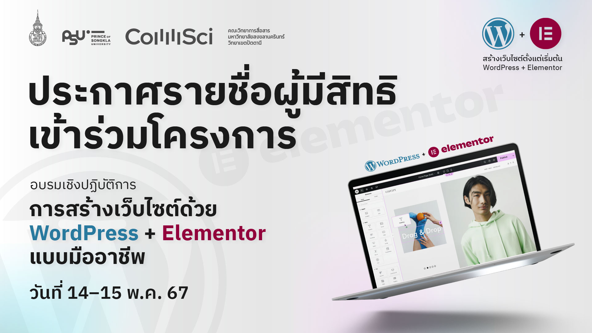 ประกาศรายชื่อผู้มีสิทธิเข้าร่วมโครงการอบรมเชิงปฏิบัติการ “การสร้างเว็บไซต์ด้วย WordPress + Elementor แบบมืออาชีพ”
