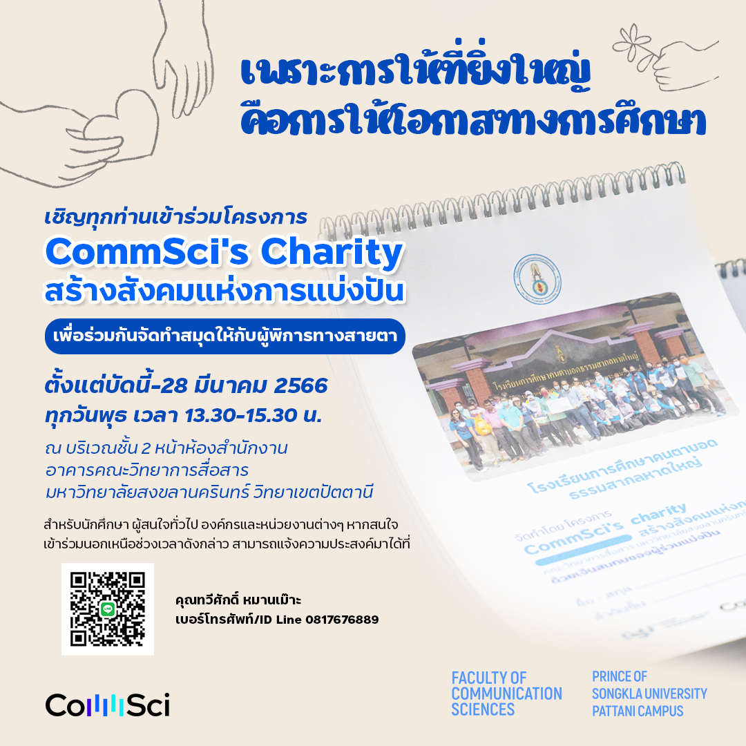 เชิญชวนทุกท่านเข้าร่วม “โครงการ CommSci’s Charity สร้างสังคมแห่งการแบ่งปัน” เพื่อร่วมกันจัดทำสมุดให้กับผู้พิการทางสายตา