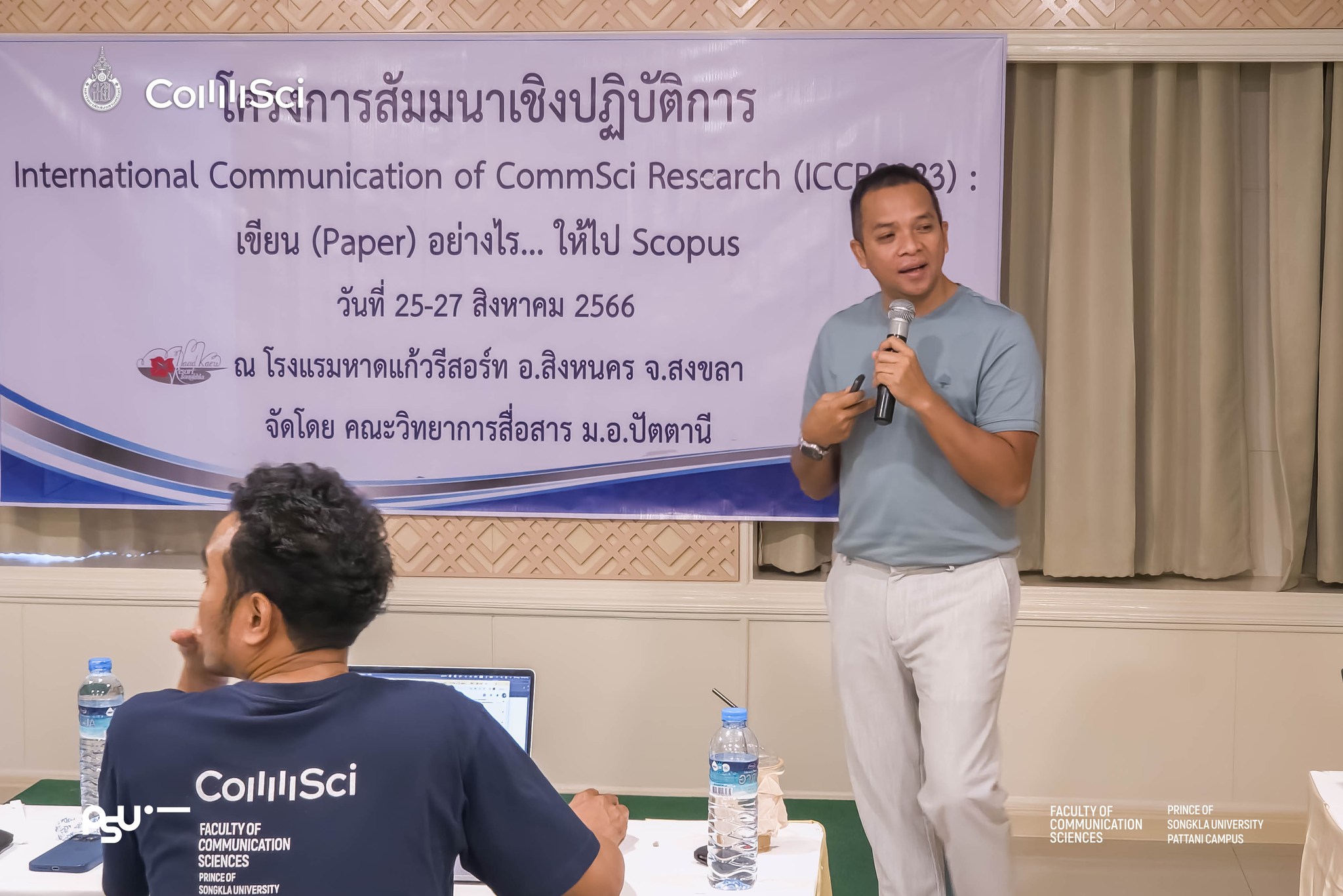 คณะวิทยาการสื่อสาร จัดโครงการสัมมนาเชิงปฏิบัติการ International Communication of Commsci Research (ICCR2023): เขียน (Paper) อย่างไร…ให้ไป Scopus ระหว่างวันที่ 25-27 สิงหาคม 2566 ณ โรงแรมหาดแก้วรีสอร์ท อ.สิงหนคร จ.สงขลา โดยได้รับเกียรติจาก รองศาสตราจารย์ ดร.ยุโสบ บุญสุข อาจารย์ประจำหลักสูตรศิลปศาสตรบัณฑิต สาขาวิชาภาษาอังกฤษ คณะมนุษยศาสตรและสังคมศาสตร์ ม.อ.ปัตตานี ซึ่งเป็นผู้ที่มีความรู้ ความเชี่ยวชาญและประสบการณ์ในการเขียนบทความตีพิมพ์ระดับชาติและนานาชาติ โดยโครงการฯ มีวัตุถประสงค์เพื่อส่งเสริมให้นักวิจัยและบุคลากรสายวิชาการเขียนบทความวิจัยเพื่อตีพิมพ์ในวารสารระดับนานาชาติที่อยู่ในฐานข้อมูล ISI และ SCOPUS ทั้งนี้ คาดหวังว่านักวิจัยและบุคลากรสายวิชาการจะสามารถมีผลงานตีพิมพ์ในวารสารระดับนานาชาติเพิ่มขึ้น ซึ่งเป็นหนึ่งในพันธกิจด้านวิจัยของคณะวิทยาการสื่อสารเพื่อขับเคลื่อนและส่งเสริมพัฒนางานวิจัยในการผลิตผลงานทางวิชาการ