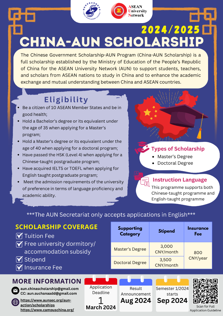 AUN Secretariat ประชาสัมพันธ์ทุน China-AUN Scholarship 2024/2025 (The Chinese Government Scholarship-AUN Programme)