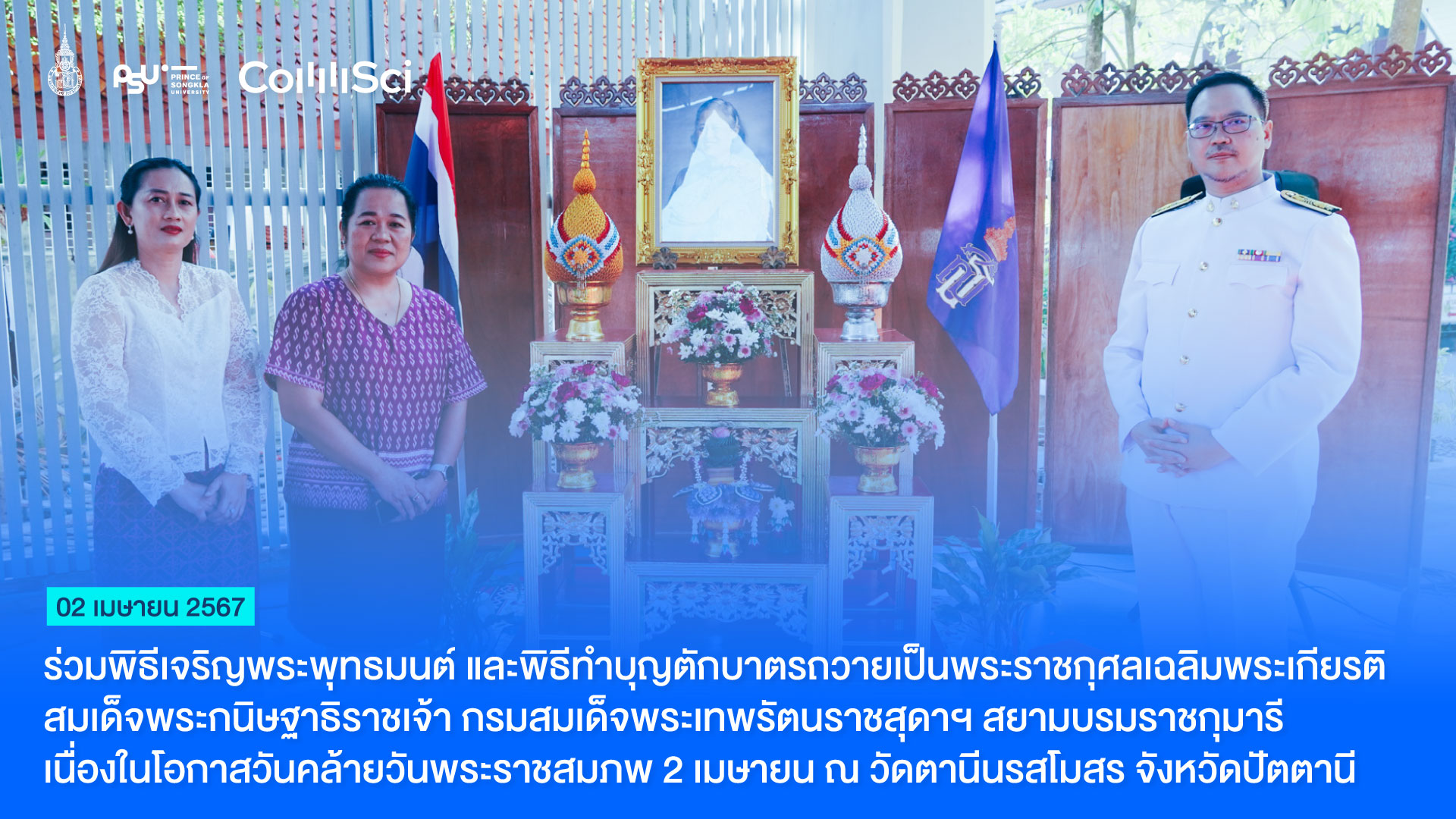 เช้าวันนี้ (2 เมษายน 2567) คุณพิมพ์ชนก พลวรรณ หัวหน้าสำนักงานคณะวิทยาการสื่อสาร พร้อมด้วยคุณยุพดี อุดมพงศ์ บุคลากรคณะวิทยาการสื่อสาร ร่วมพิธีเจริญพระพุทธมนต์ และพิธีทำบุญตักบาตรถวายเป็นพระราชกุศล เฉลิมพระเกียรติสมเด็จพระกนิษฐาธิราชเจ้า กรมสมเด็จพระเทพรัตนราชสุดาฯ สยามบรมราชกุมารี เนื่องในโอกาสวันคล้ายวันพระราชสมภพ 2 เมษายน ณ วัดตานีนรสโมสร จังหวัดปัตตานี โดยมี นายสนั่น สนธิเมือง รองผู้ว่าราชการจังหวัดปัตตานี เป็นประธานในพิธี และ ผศ.ดร.อัตชัย เอื้ออนันตสันต์ รองอธิการบดีวิทยาเขตปัตตานี พร้อมบุคลากร มหาวิทยาลัยสงขลานครินทร์ วิทยาเขตปัตตานี หัวหน้าส่วนราชการ พสกนิกรทุกหมู่เหล่าเข้าร่วมพิธีดังกล่าว