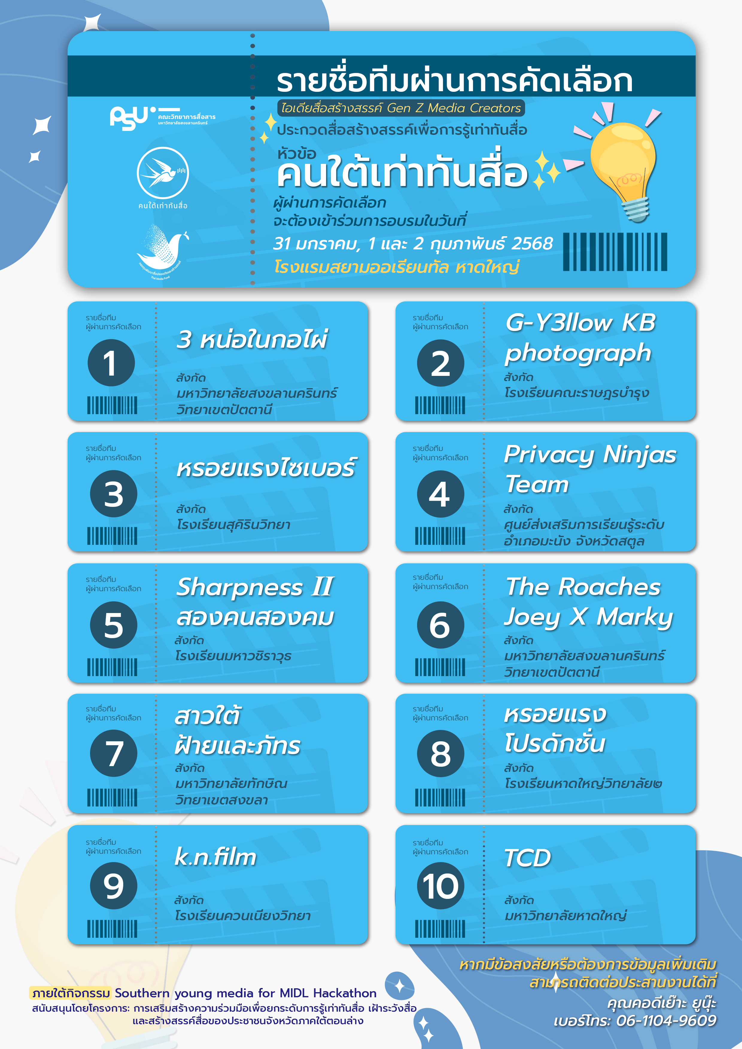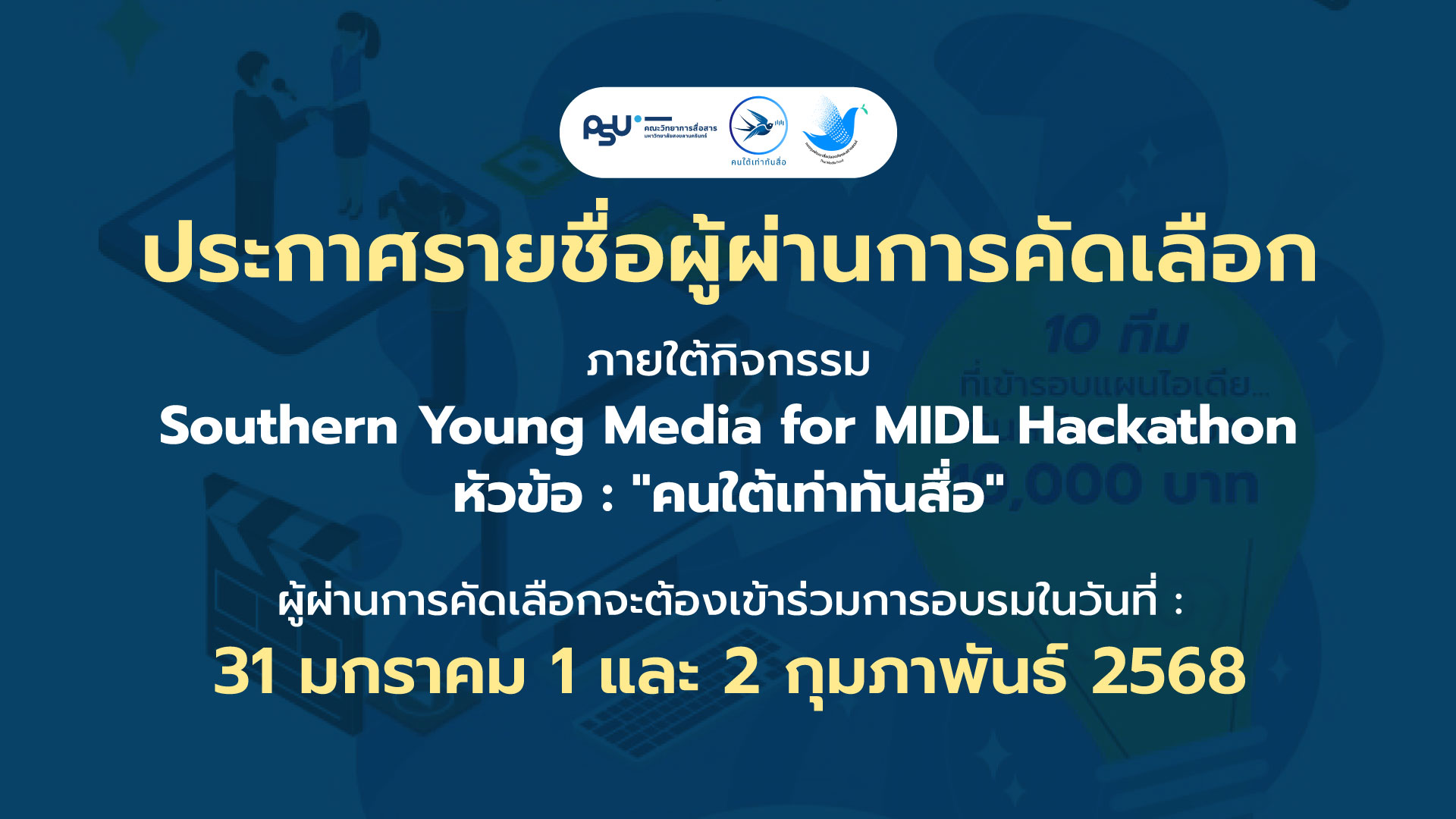 โครงการเสริมสร้างความร่วมมือและการมีส่วนร่วมเพื่อยกระดับการรู้เท่าทันสื่อ การเฝ้าระวังสื่อ และการสร้างสรรค์สื่อของประชาชนในจังหวัดภาคใต้ตอนล่าง #คนใต้เท่าทันสื่อ ขอแสดงความยินดีแก่ผู้ที่ผ่านการคัดเลือกแผนไอเดียในการเข้าร่วมกิจกรรม Southern Young Media for MIDL Hackathon! จำนวน 10 ทีม