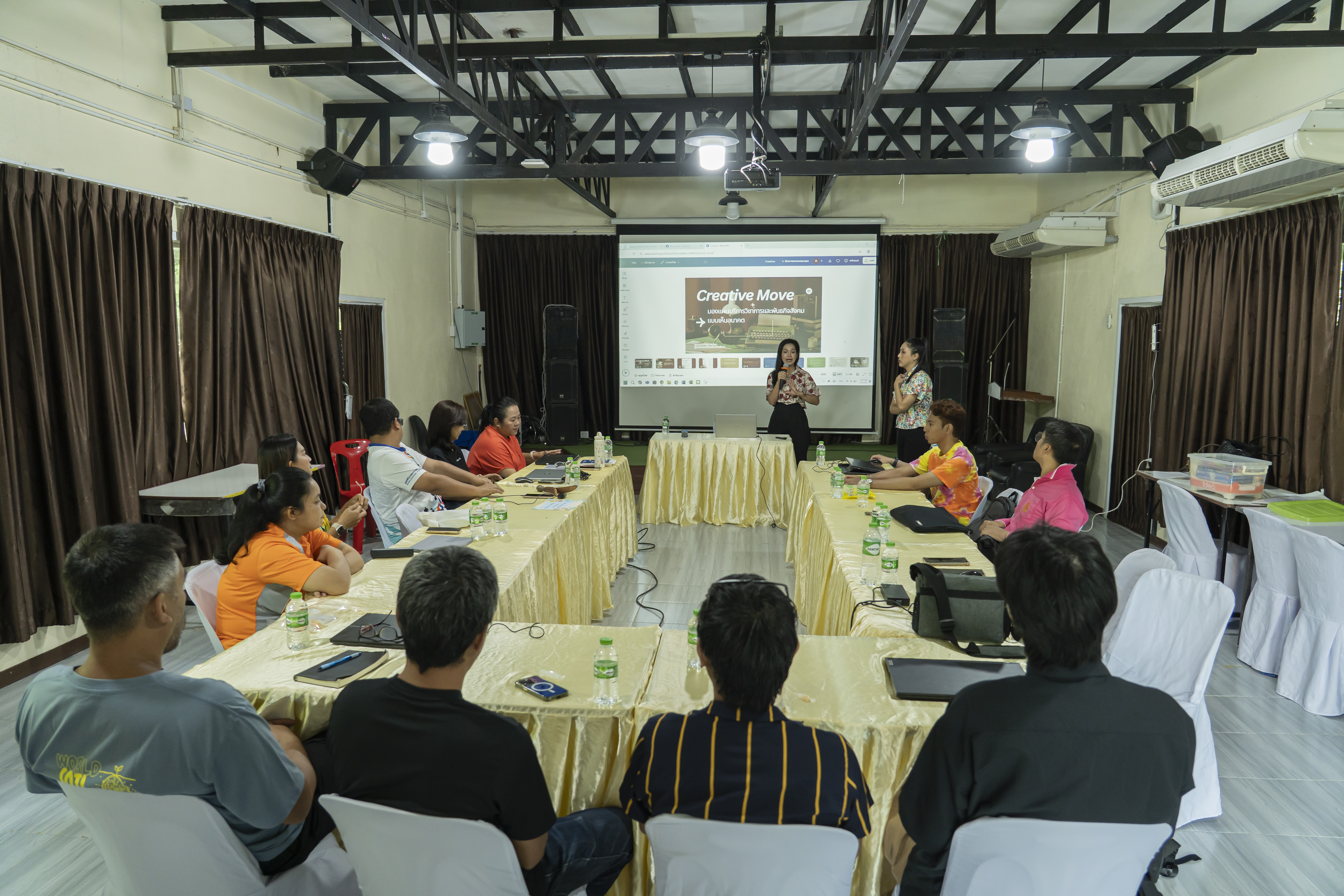 จากการลงพื้นที่แลกเปลี่ยนเรียนรู้ในวันแรก คณะวิทยาการสื่อสารได้นำข้อมูลมาตกผลึกเป็นประเด็นสำคัญ เพื่อนำไปสู่การบริหารจัดการกิจกรรมและการขับเคลื่อนพันธกิจสังคมของคณะฯ อย่างเป็นระบบ โดยในวันที่สอง ด้านสำนักงานบริหารคณะวิทยาการสื่อสาร ได้จัดกิจกรรมเวิร์กชอป “Creative Move: มองแผนบริการวิชาการและพันธกิจสังคมแบบเห็นอนาคต” เพื่อระดมความคิดเห็นและออกแบบทิศทางการดำเนินงานในอนาคต กิจกรรมดังกล่าวดำเนินโดย ผู้ช่วยศาสตราจารย์ ดร. อาทิตยา สมโลก ผู้ช่วยคณบดีฝ่ายพันธกิจสังคม ซึ่งทำหน้าที่เป็นวิทยากรกระบวนการ นำทีมร่วมทำ SWOT Analysis เพื่อวิเคราะห์สถานการณ์ พร้อมนำเสนอแนวคิด “Move Now Move Next” ที่เชื่อมโยงการทำงานระยะสั้นและระยะยาว พร้อมเปิดพื้นที่ให้ทุกคนได้ร่วมแสดง Commitment ในการขับเคลื่อนพันธกิจสังคมของคณะในภาพรวมอย่างเป็นรูปธรรม