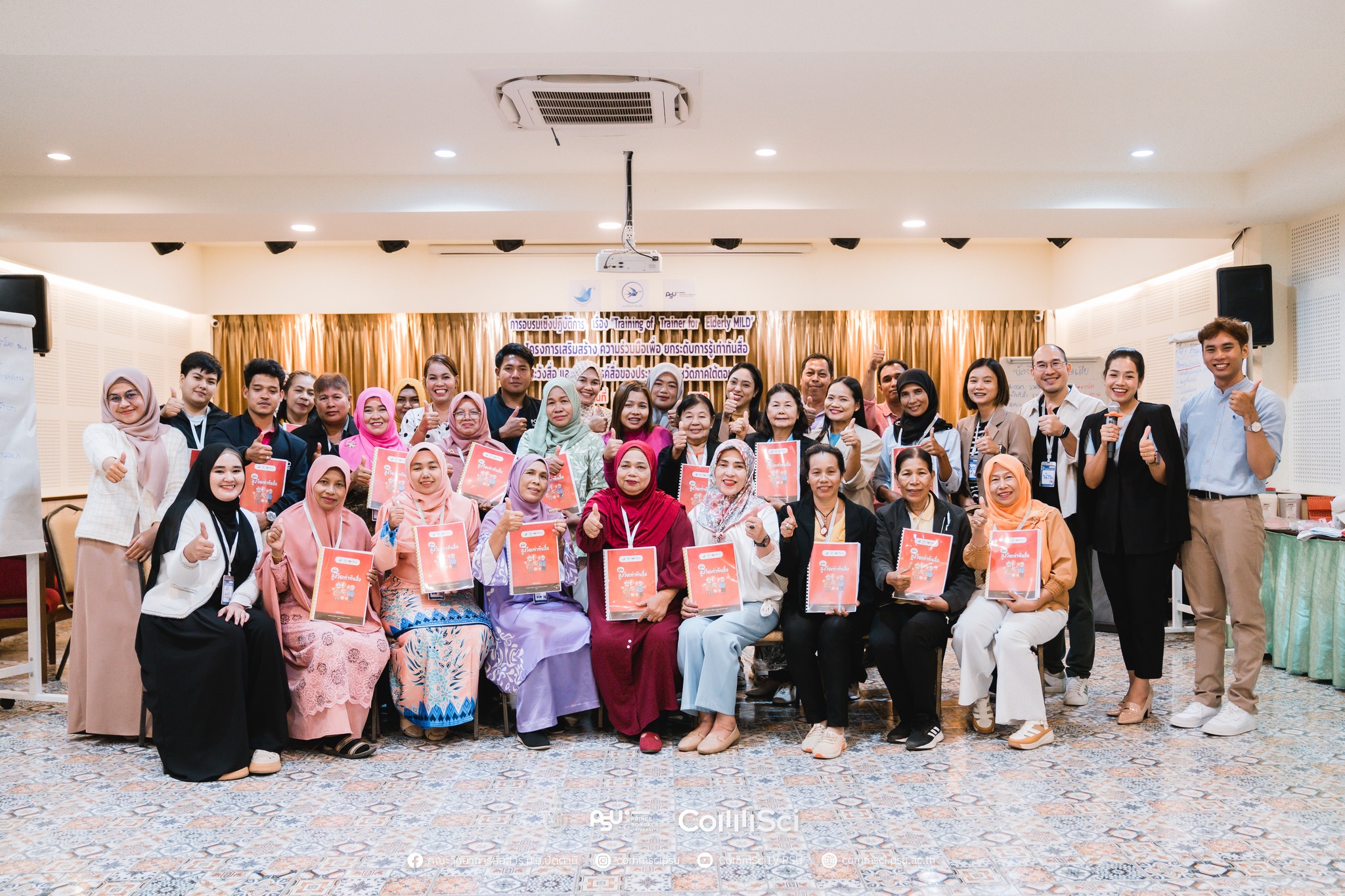 คณะวิทยาการสื่อสาร มหาวิทยาลัยสงขลานครินทร์ จัดอบรมเชิงปฏิบัติการ “Training of Trainer for Elderly MIDL” ระหว่างวันที่ 16–18 พฤษภาคม 2568 ณ โรงแรมเซาท์เทอร์นแอร์พอร์ท อำเภอหาดใหญ่ จังหวัดสงขลา ภายใต้โครงการเสริมสร้างความร่วมมือเพื่อยกระดับการรู้เท่าทันสื่อ เฝ้าระวัง และสร้างสรรค์สื่อของประชาชนในจังหวัดภาคใต้ตอนล่าง โดยมีเป้าหมายเพื่อถ่ายทอดองค์ความรู้และแนวทางการใช้ “คู่มือสูงวัยเท่าทันสื่อ” แก่ผู้แทนจากผู้สูงอายุในพื้นที่ 5 จังหวัดภาคใต้ตอนล่าง คือ สตูล สงขลา ปัตตานี ยะลา และนราธิวาส เพื่อให้สามารถนำไปประยุกต์ใช้และเผยแพร่ต่อในระดับชุมชนได้อย่างมีประสิทธิภาพ