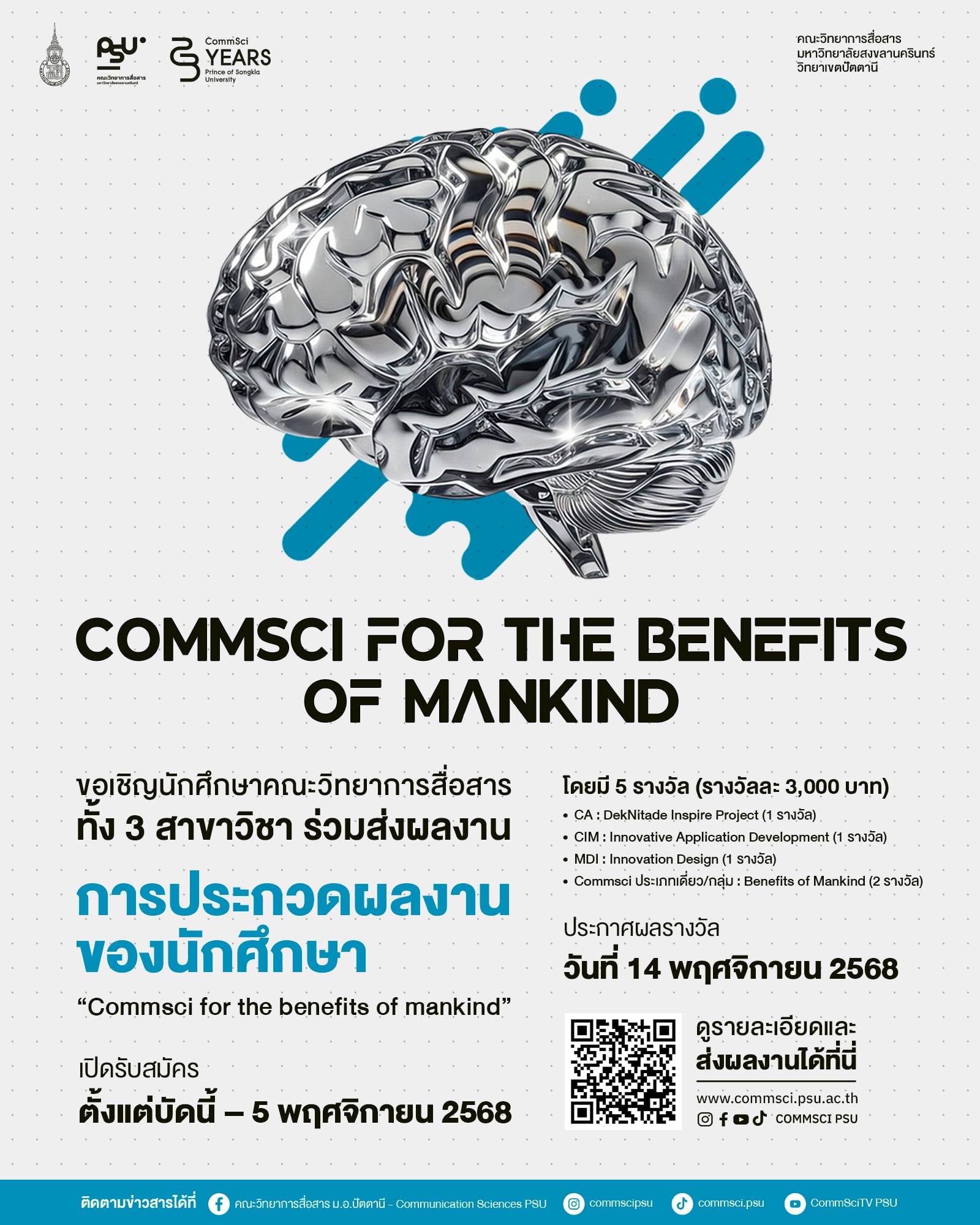 - CommSci รางวัลด้านนวัตกรรมเพื่อประโยชน์เพื่อนมนุษย์ : ผลงานที่เป็นนวัตกรรมที่สร้างคุณประโยชน์ให้แก่ชุมชน สังคม และเพื่อนมนุษย์ ตามพระราชปณิธานที่ว่า “our souls is for the benefits of mankid”
