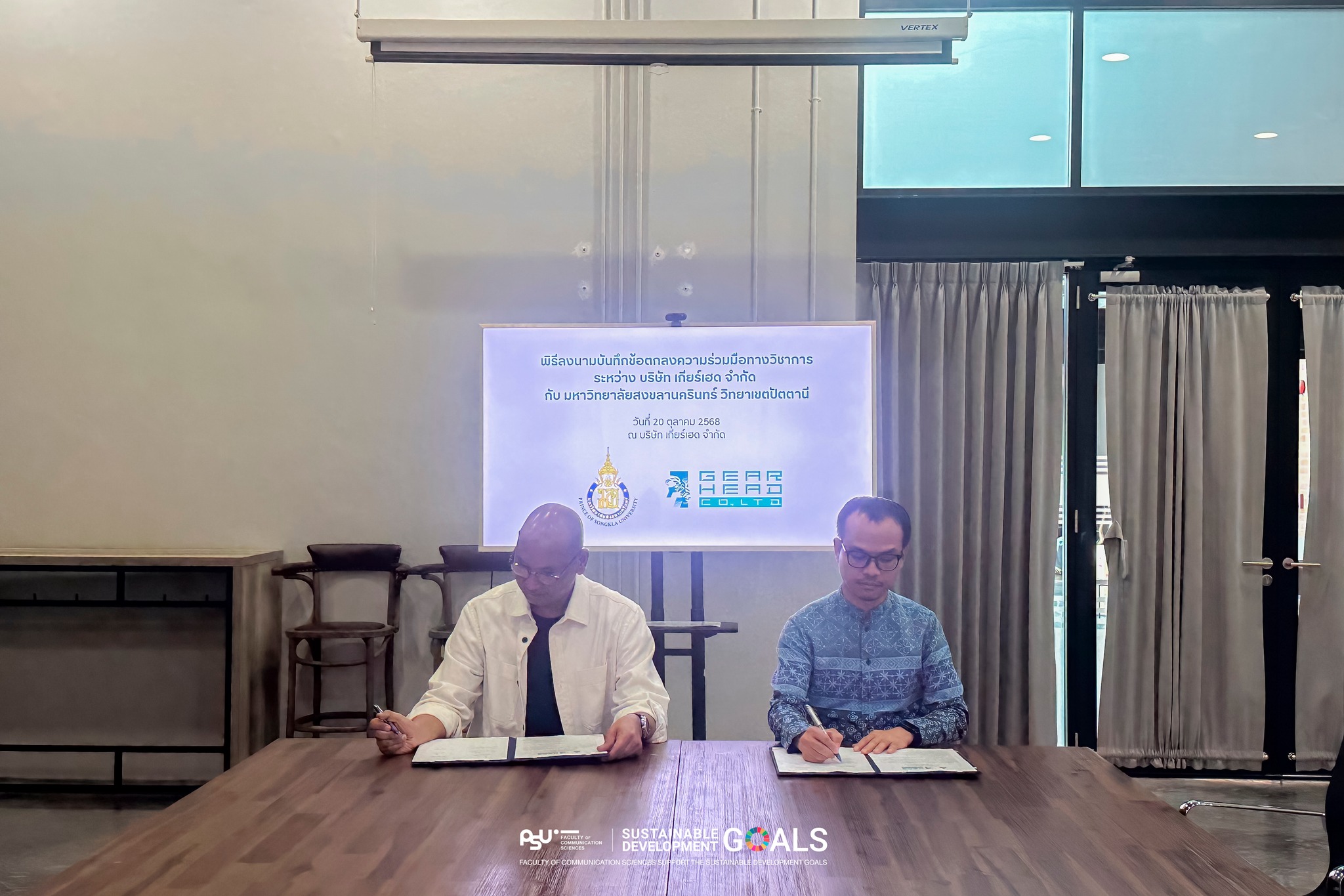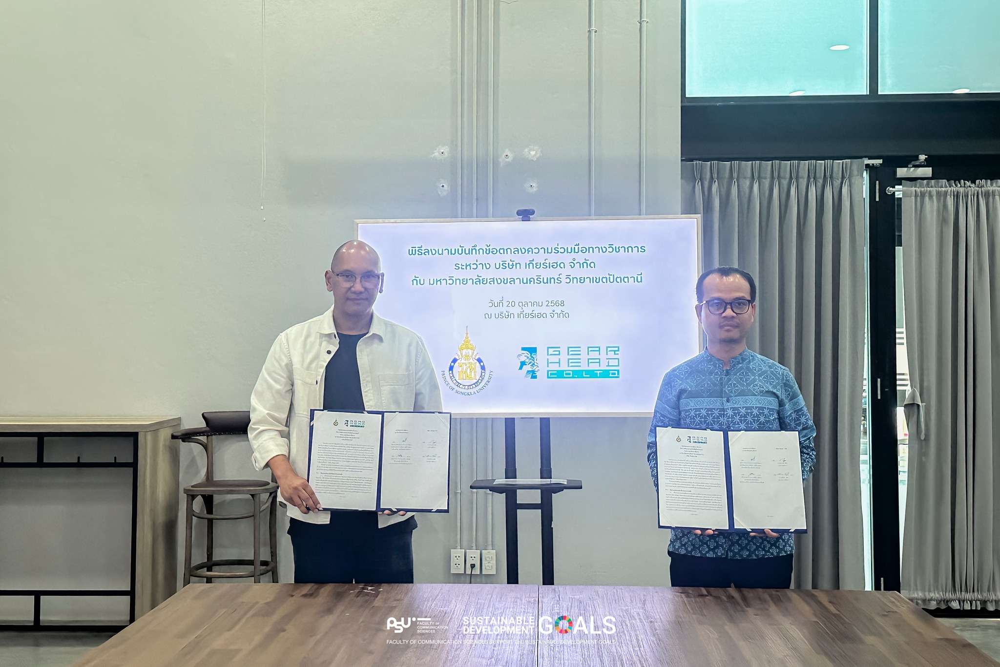 เมื่อวันที่ 20 ตุลาคม 2568 ที่ผ่านมา คณะวิทยาการสื่อสาร มหาวิทยาลัยสงขลานครินทร์ วิทยาเขตปัตตานี ได้ร่วมลงนามในบันทึกข้อตกลงความร่วมมือทางวิชาการ (MOU) กับ บริษัท เกียร์เฮด จำกัด ซึ่งเป็นบริษัทชั้นนำด้านการให้บริการจัดหาอุปกรณ์และการสนับสนุนการผลิตภาพยนตร์ ซีรีส์ และรายการต่าง ๆ จากทั่วโลก โดยมี ผู้ช่วยศาสตราจารย์ ดร.ภีรกาญจน์ ไค่นุ่นนา คณบดีคณะวิทยาการสื่อสาร และ นายชยานนท์ อุลิศ กรรมการผู้จัดการ บริษัท เกียร์เฮด จำกัด ร่วมลงนาม ในโอกาสนี้ทั้งสองหน่วยงานได้แลกเปลี่ยนประสบการณ์ระหว่างกันในด้านการจัดการเรียนการสอนด้านการผลิตสื่อภาพยนตร์ของคณะวิทยาการสื่อสาร และการดำเนินธุรกิจของ บริษัท เกียร์เฮด จำกัด รวมถึงการสนับสนุนการจัดการเรียนการสอน จากนั้นได้เยี่ยมชมอุปกรณ์การถ่ายทำและสถานที่ต่าง ๆ ของบริษัทที่ให้บริการแก่ผู้ผลิตภาพยนตร์และรายการบันเทิงต่าง ๆ