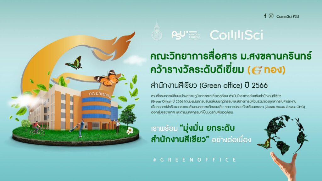 คณะวิทยาการสื่อสาร ม.สงขลานครินทร์ “คว้ารางวัลระดับดีเยี่ยม (G ทอง)” สำนักงานสีเขียว (Green office) ปี 2566 พร้อม “มุ่งมั่น ยกระดับ สำนักงานสีเขียว” อย่างต่อเนื่อง