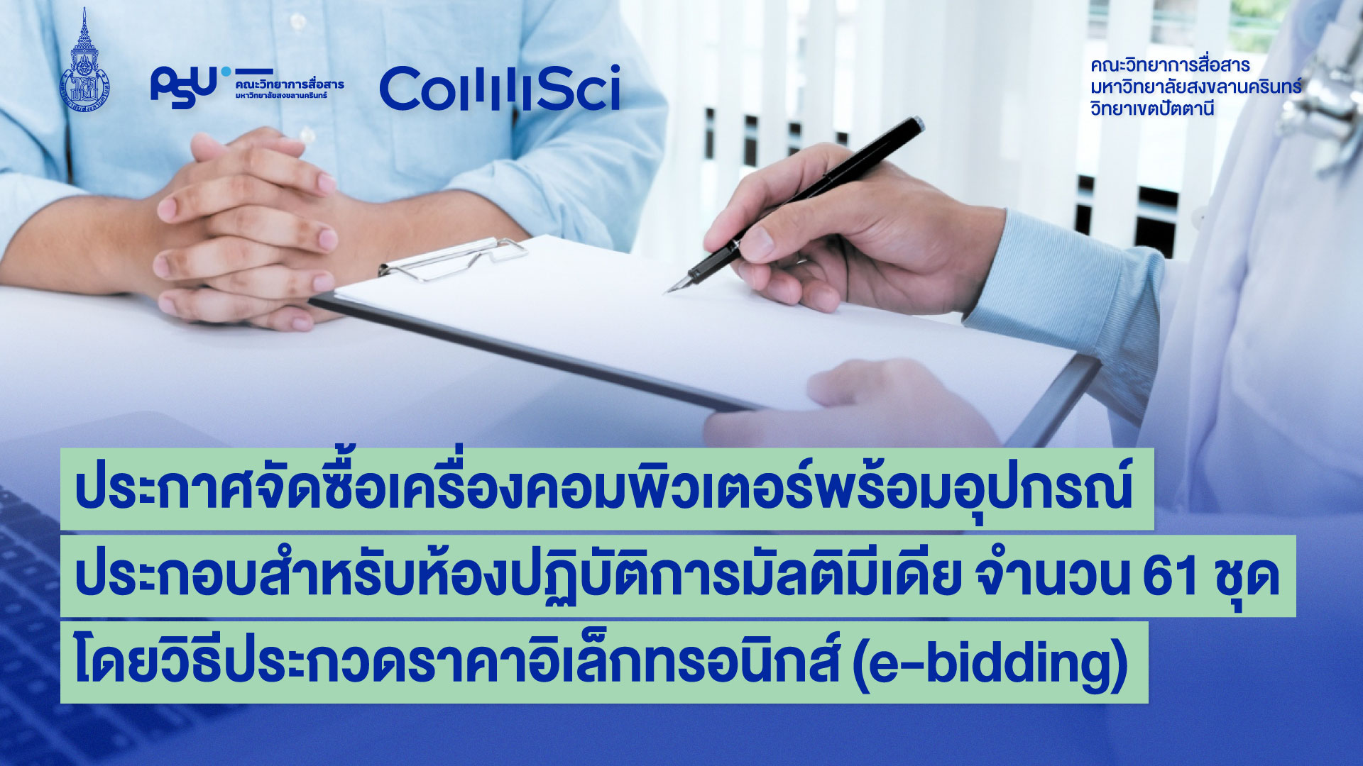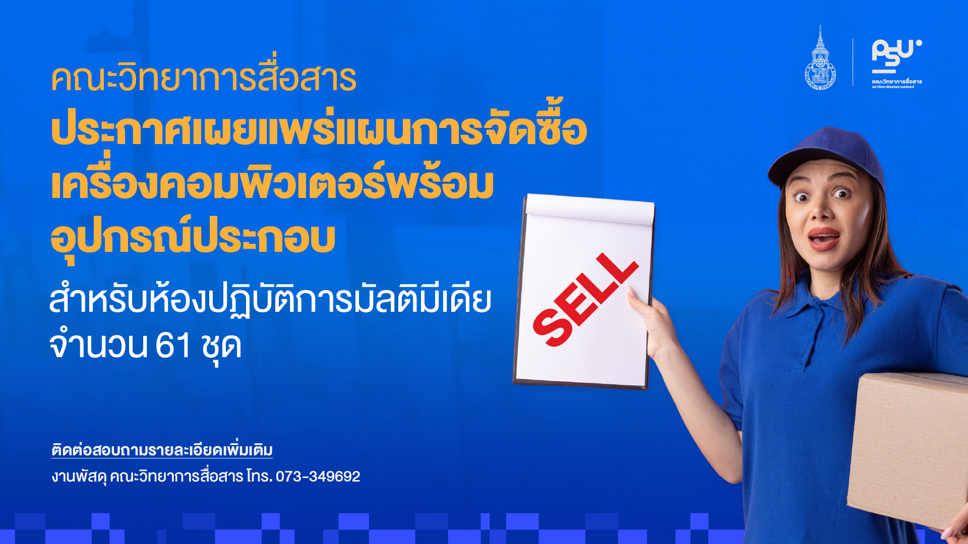 ประกาศเผยแพร่แผนการจัดซื้อเครื่องคอมพิวเตอร์พร้อมอุปกรณ์ประกอบ สำหรับห้องปฏิบัติการมัลติมีเดีย จำนวน 61 ชุด ติดต่อสอบถามรายละเอียดเพิ่มเติมงานพัสดุ คณะวิทยาการสื่อสาร โทร. 073-349692 (ในวันและเวลาราชการ)