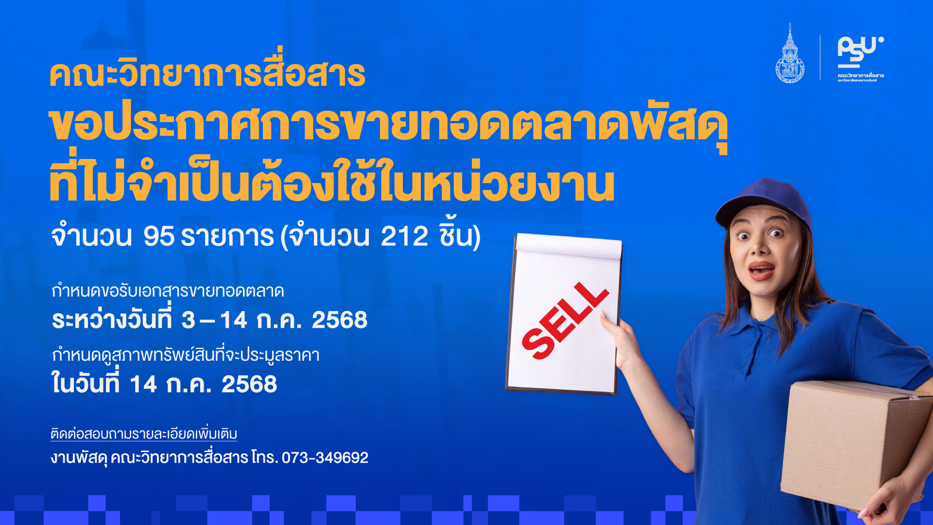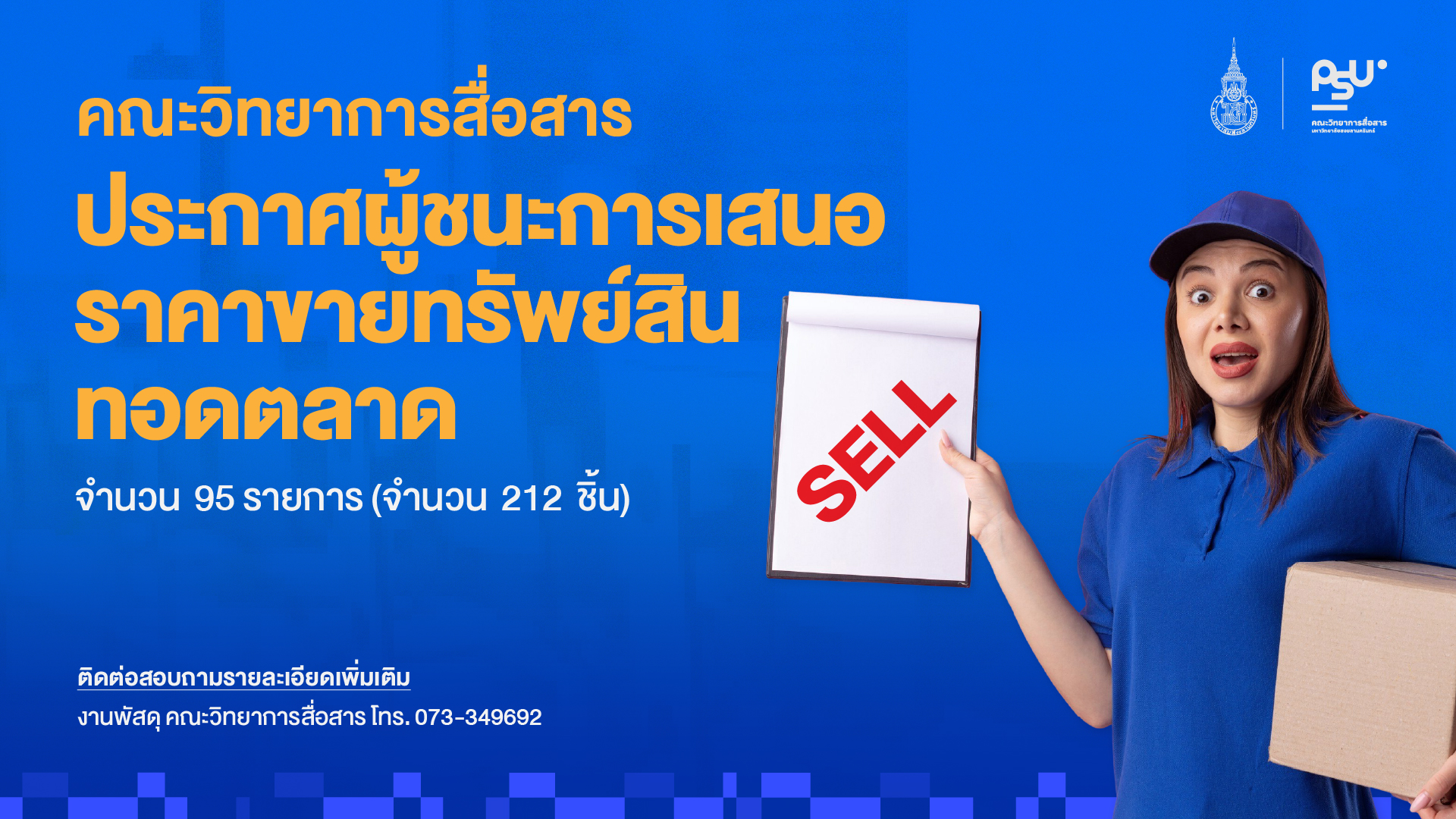 คณะวิทยาการสื่อสาร ประกาศผู้ชนะการเสนอราคาขายทรัพย์สินทอดตลาด จำนวน 95 รายการ (จำนวน 212 ชิ้น) ติดต่อสอบถามรายละเอียดเพิ่มเติมงานพัสดุ คณะวิทยาการสื่อสาร โทร. 073-349692 (ในวันและเวลาราชการ)