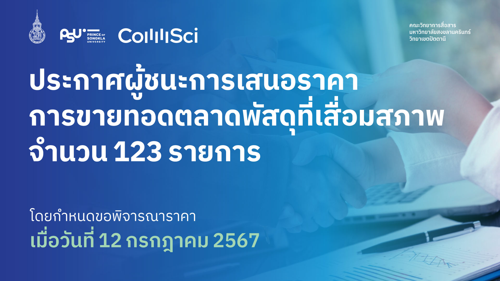 ประกาศผลผู้ชนะการเสนอราคา การจัดซื้อชุดคอมพิวเตอร์แบบตั้งโต๊ะพร้อมระบบปฏิบัติการ จำนวน 41 ชุด ด้วยวิธีประกวดราคาอิเล็กทรอนิกส์ (e-bidding) [pdf-embedder url=”https://www.commsci.psu.ac.th/wp-content/uploads/2025/01/ประกาศผลผู้ชนะการเสนอราคา.pdf”]