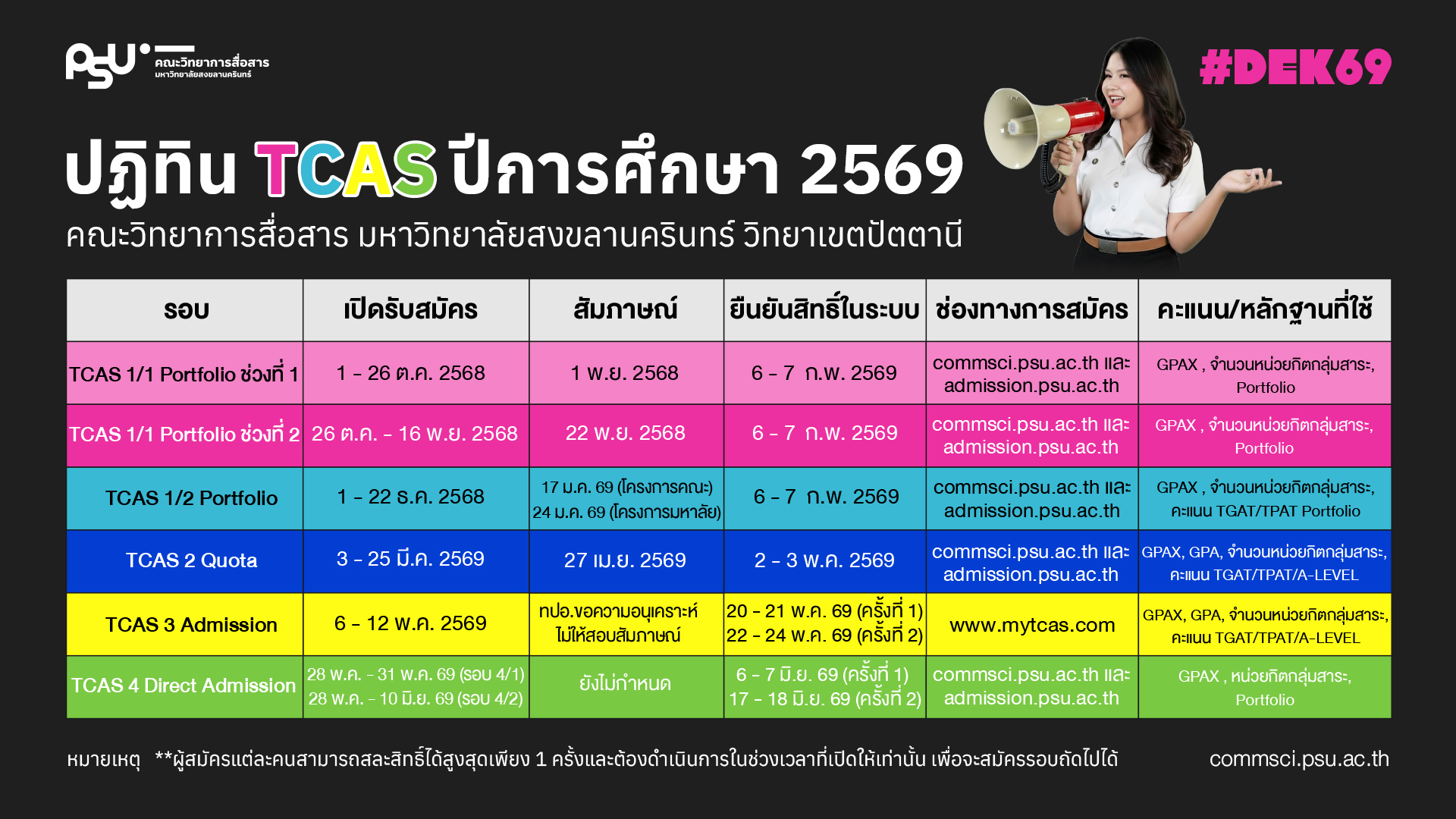 ผ่านเว็บไซต์ : commsci.psu.ac.th/tcas69 - ชำระค่าสมัคร : (ช่วงที่ 1) วันที่ 1-26 ต.ค. 2568 | (ช่วงที่ 2) วันที่ 1-16 พ.ย. 2568